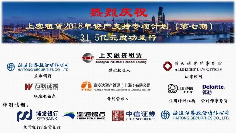 最后,特別鳴謝浦發(fā)銀行、渤海銀行、中信證券、中國(guó)銀行及江蘇銀行等投資者的大力支持、感謝各位投資者對(duì)上實(shí)租賃的信任,同時(shí)向海通證券等承銷機(jī)構(gòu)致以誠(chéng)摯謝意。上實(shí)租賃將秉承“不忘初心”的宗旨,在資產(chǎn)證券化領(lǐng)域“砥礪前行”。