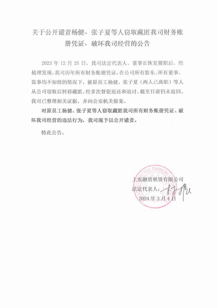 對原員工楊健、張子夏等人竊取藏匿我司所有財務(wù)賬冊憑證、破壞我司經(jīng)營的違法行為,我司現(xiàn)予以公開譴責(zé)。